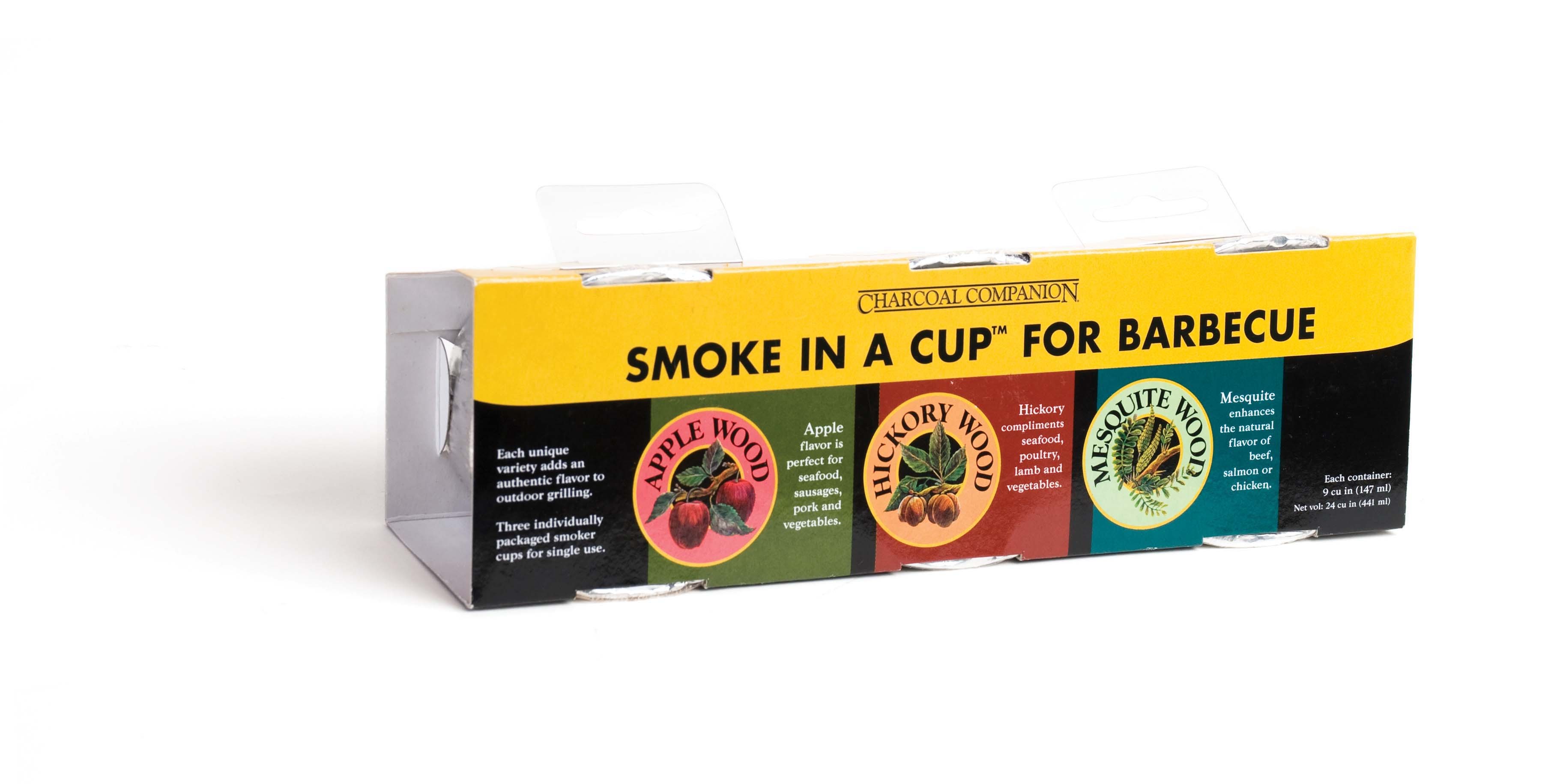 Smoke in a cup sampak. Sampak af Hickory, Mesquite og æble lige klar til grillen. Tag den ud af pakken, fjern folien for hullet og den er klar til grillen og giver den lækre røgsmag til din mad.