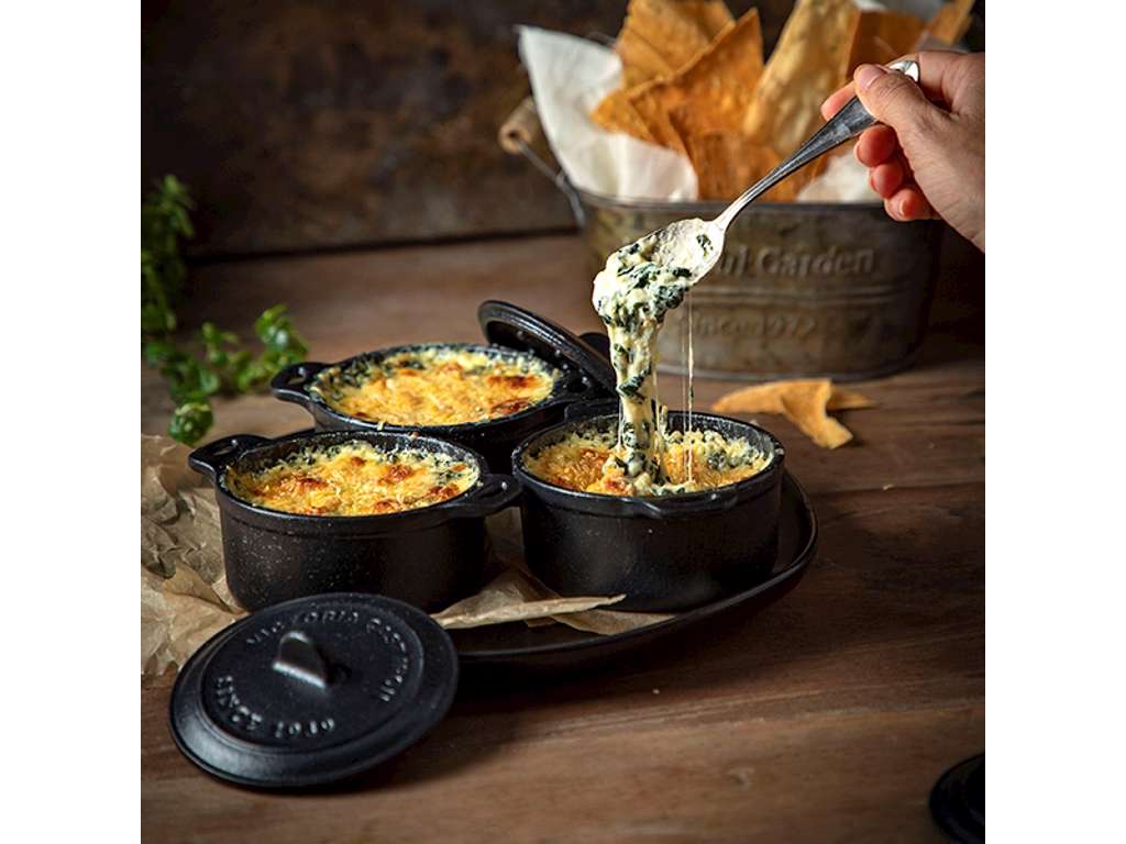 Fremstillet af genbrugsstøbejern og forbehandlet med 100% naturligt hørfrøolie, hver mini gryde bærer arven fra tidløs holdbarhed og ægte håndværk, der vil blive skattet i generationer. Med sin kompakte størrelse og alsidighed kan den bruges på alle varmekilder - fra grill til induktion - og dens evne til at tåle ovnens varme åbner op for en verden af kreative kulinariske muligheder.