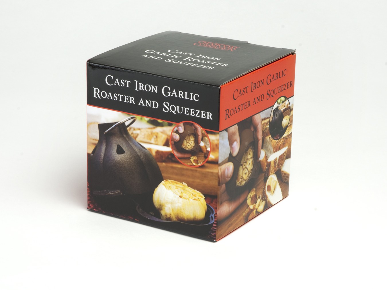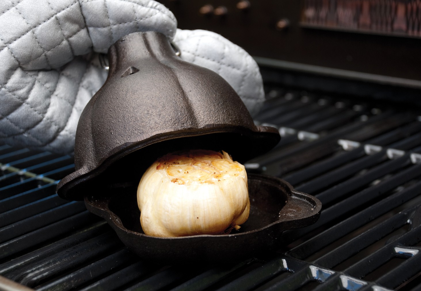 Smart støbejerns rack til hvidløg. Brug silicone værktøjet til at presse de grillede hvidløg ud, uden at brænde fingrene.