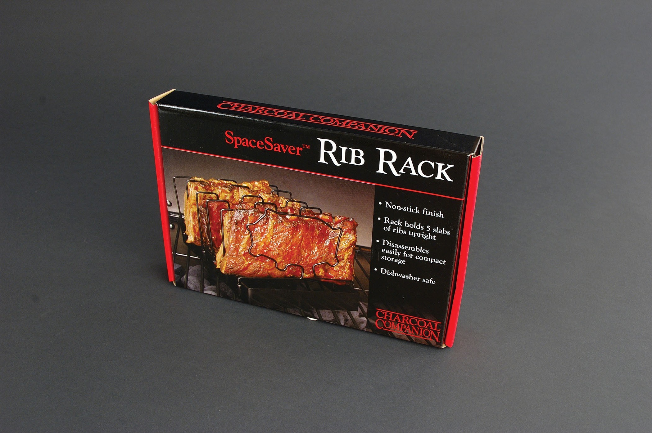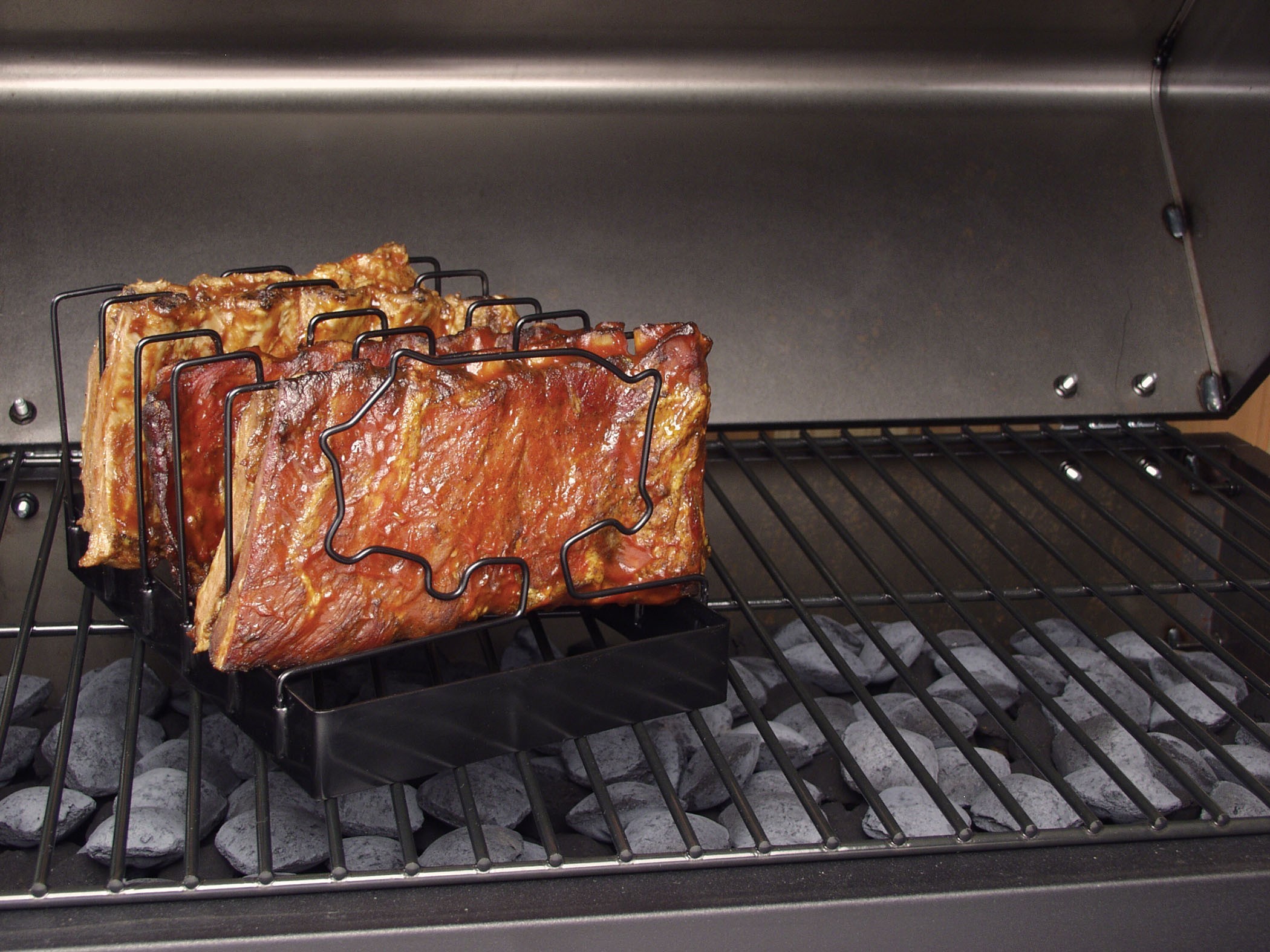 Rack til ribs der kan foldes sammen for lettere opbevaring. Holder op til fem slabs på gang.